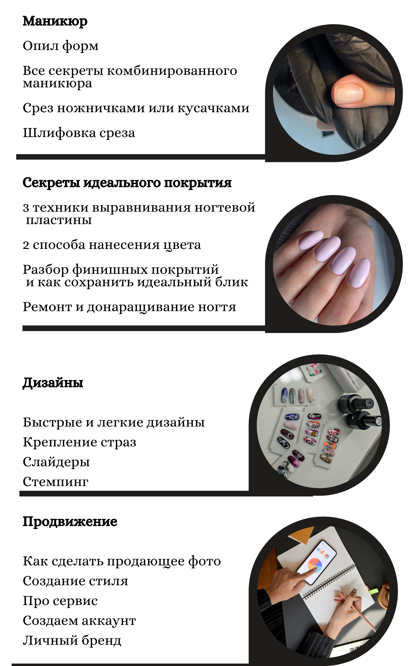 даст представление о поиске клиентов, создания портфолио, ведения соцсетей, и дальнейшего развития вас в маникюрном бизнесе.